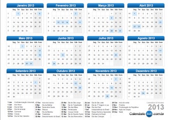 Se você é do tipo precavido, que gosta de prever tudo, talvez esteja na hora de baixar um calendário de 2013 para começar a planificar o próximo ano. Este Calendário 2013 Anual em formato PDF, tem um design bem agradável e traz todos os feriados no Brasil.