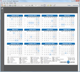 Todos os meses aparecem agrupados numa única folha. Por ser um documento em formato PDF, você pode imprimir uma cópia em papel ou trabalhar online com ele, adicionando notas e lembretes.